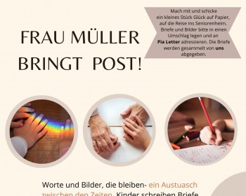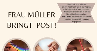 Unter dem Motto „Frau Müller bringt Post“ laden wir Kinder, Jugendliche und Familien ein, Briefe und bunte Bilder für die Bewohnerinnen und Bewohner des Seniorenheims Lindenhof in Neersen zu gestalten.