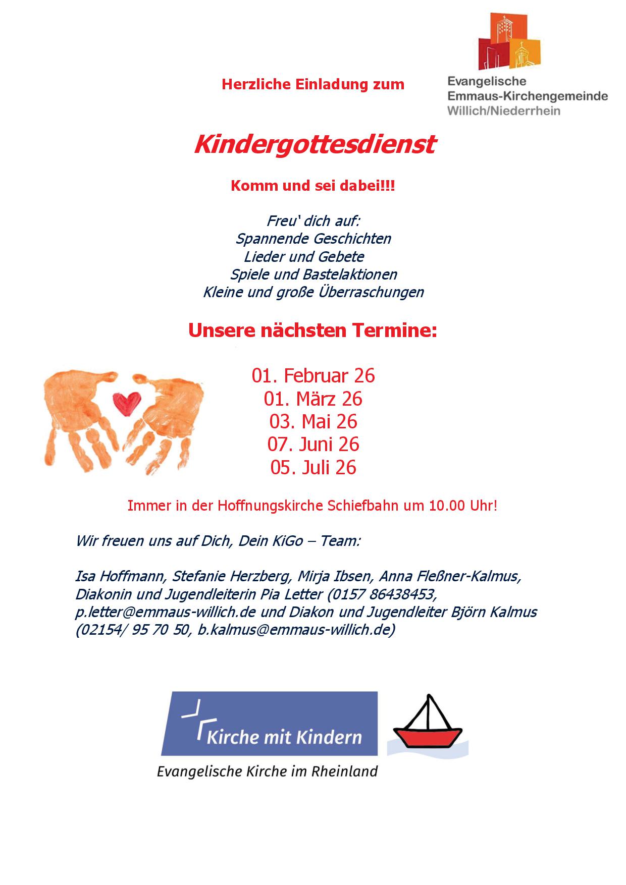 Die Ev. Emmaus-Kirchengemeinde Willich lädt herzlich alle Kinder im Kindergarten- und Grundschulalter zum nächsten Kindergottesdienst am Sonntag, 01. Februar 2026, in die Hoffnungskirche nach Schiefbahn, Wallgraben/ Ecke Schwanenheide, ein. Diesmal erwartet alle Kinder ein „wunderbarer“ Kindergottesdienst rund um das Thema offene Augen. Eltern und Großeltern können gerne dabei sein. Auf dem Programm stehen eine Geschichte von Jesus und dem blinden Bartimäus, Lieder, Gebete und Spiele. Der Kindergottesdienst beginnt um 10.00 Uhr und alle großen und kleinen Besucherinnen und Besucher sind herzlich willkommen.