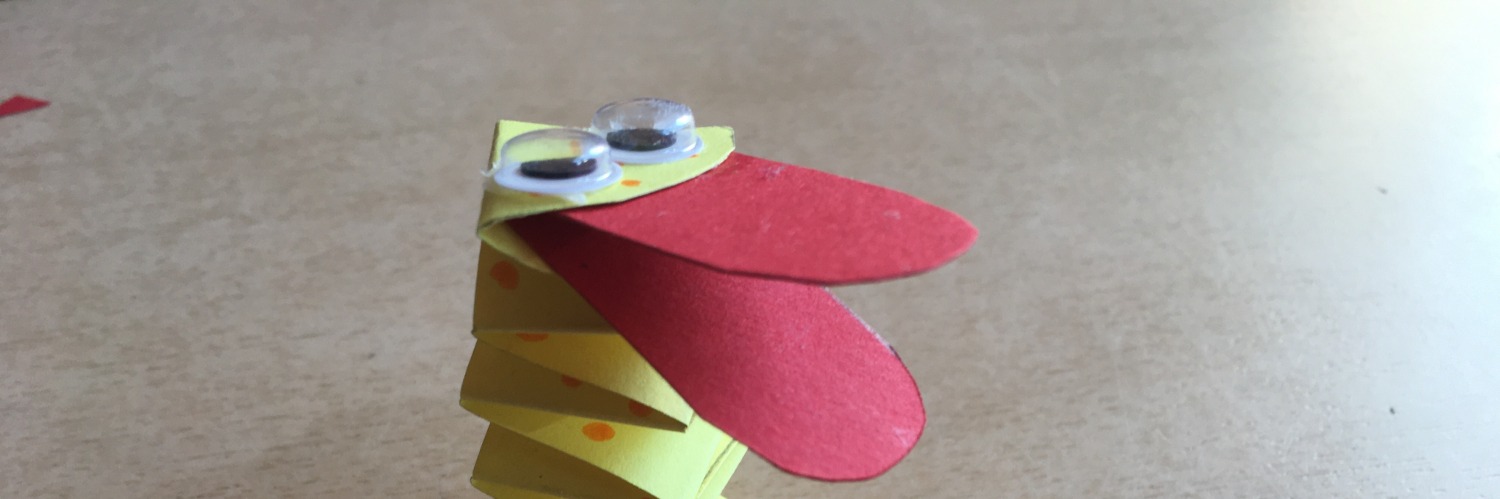 Für den Schnabel einen roten Papierstreifen zur Hälfte knicken und in Schnabelform abrunden. Das obere Ende der Hexentreppe ebenfalls abrunden zur Kopfform. Den Schabel zwischen die oberen Zacken kleben.