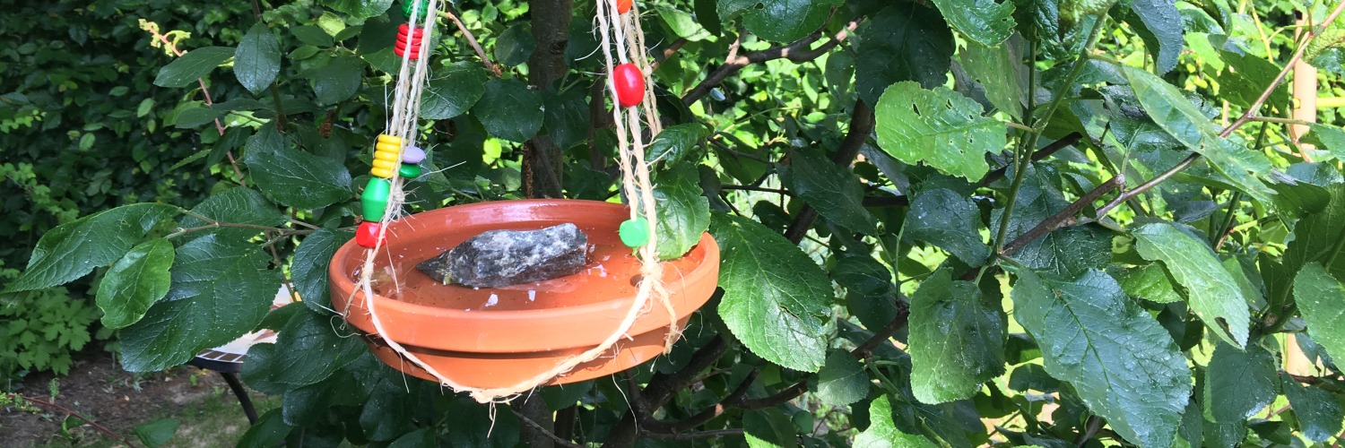 Mit wenigen Materialien lässt sich eine Vogeltränke selber bauen, die im Baum aufgehängt sogar vor Katzen sicher ist.